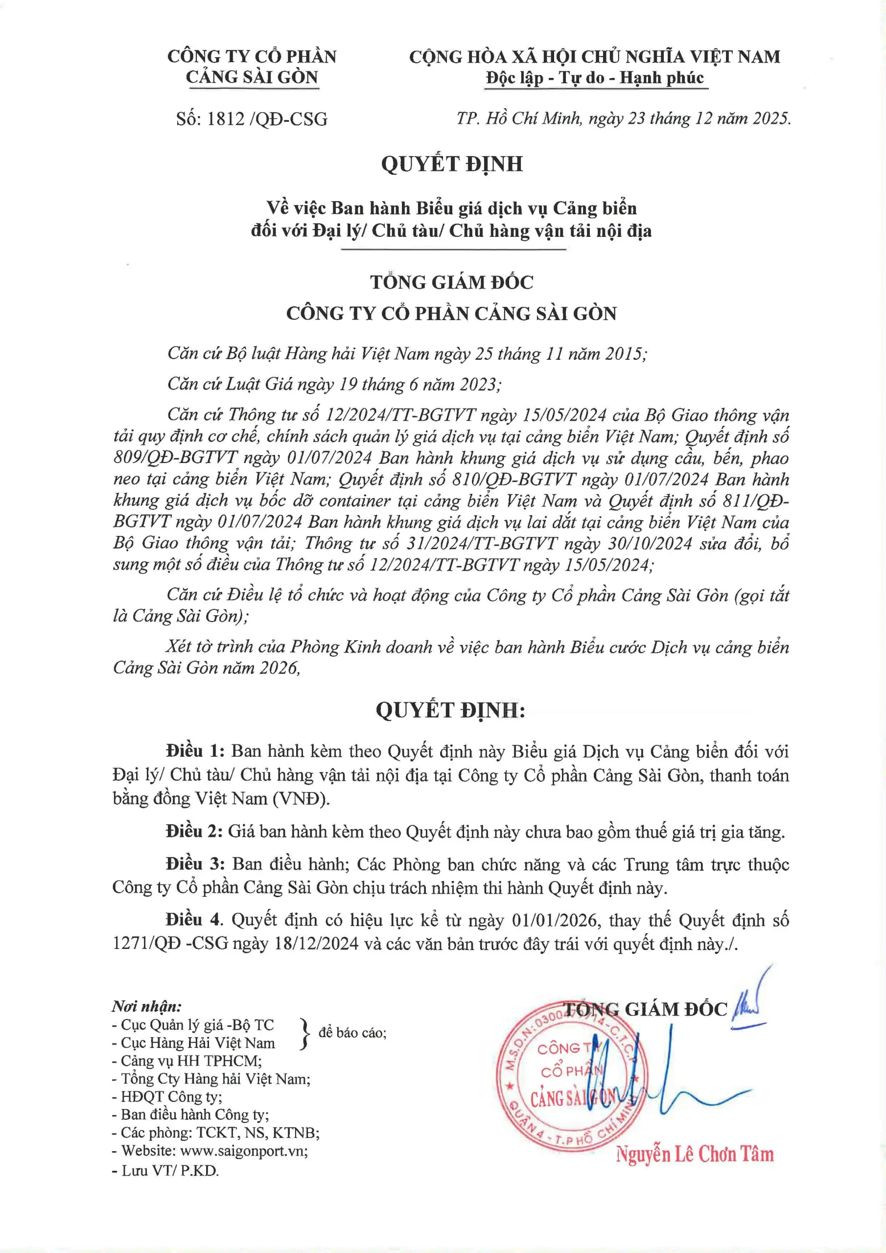 Quyết định số 146/QĐ-CSG về việc điều chỉnh biểu giá dịch vụ cảng biển đối với đại lý, chủ tàu, chủ hàng vận tải nội địa và quốc tế 2024 19/03/2024 Download Online