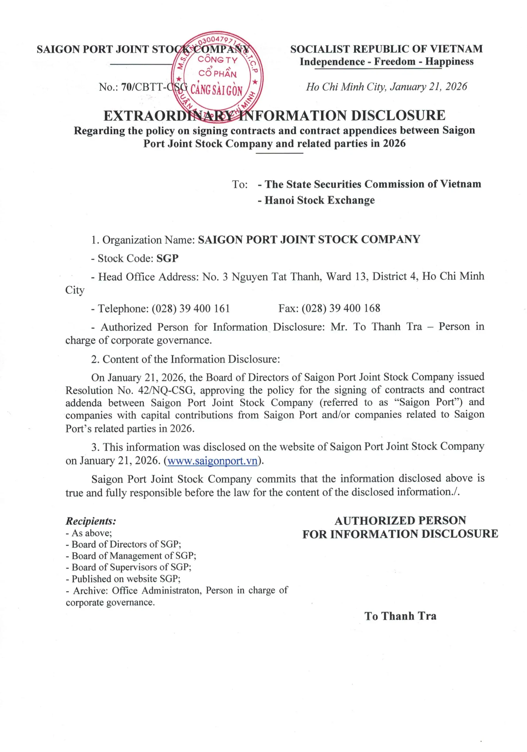 Extraordinary information disclosure regarding the policy on signing contracts and contract appendices between Saigon Port Joint Stock Company and related parties in 2026 21/01/2026