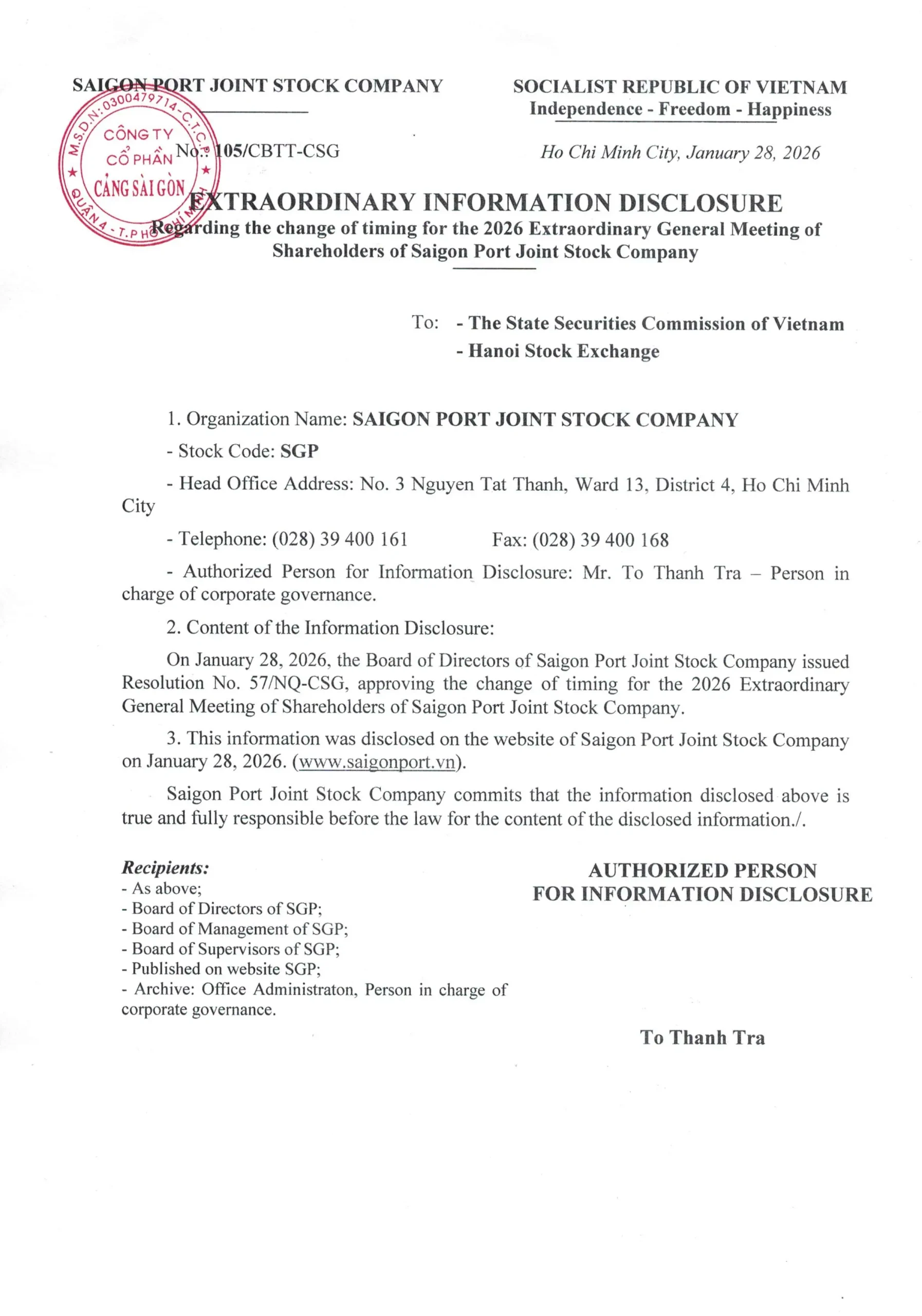 Extraordinary information disclosure regarding the change of timing for the 2026 Extraordinary General Meeting of Shareholders of Saigon Port Joint Stock Company 28/01/2026