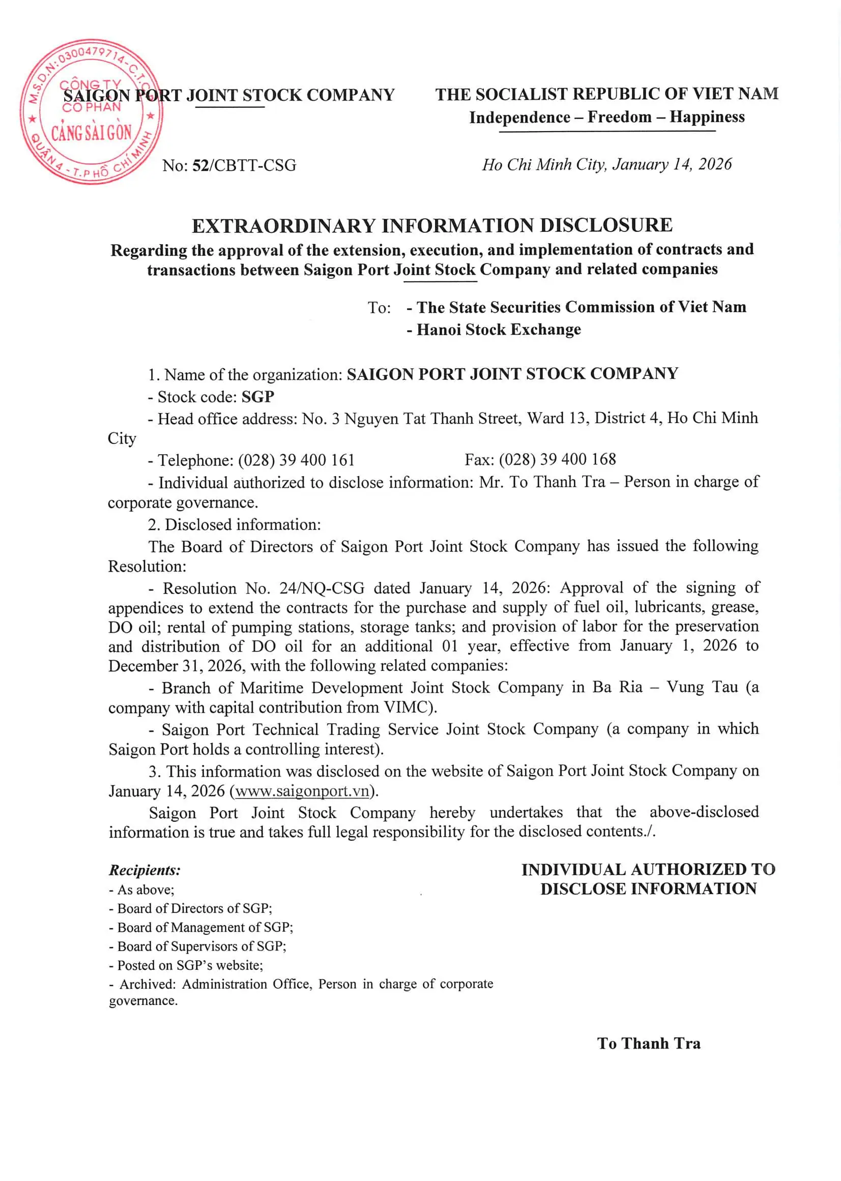 Extraordinary information disclosure regarding the approval of the extension, execution, and implementation of contracts and transactions between Saigon Port Joint Stock Company and related comapnies 14/01/2026