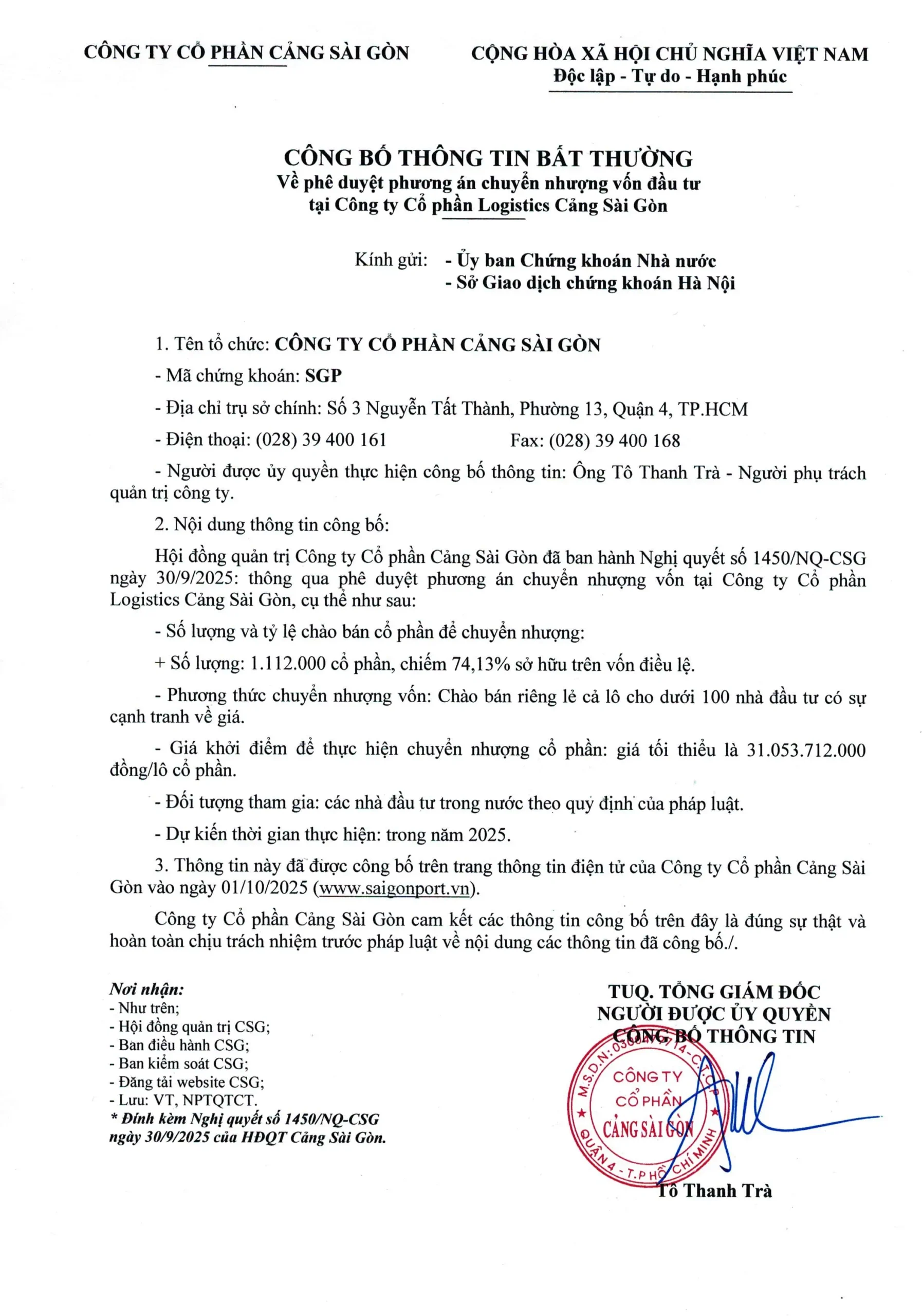 Nghị quyết về việc phê duyệt Phương án chuyển nhượng phần vốn của Công ty Cổ phần Cảng Sài Gòn tại Công ty Cổ phần Logistics Cảng Sài Gòn 30/09/2025