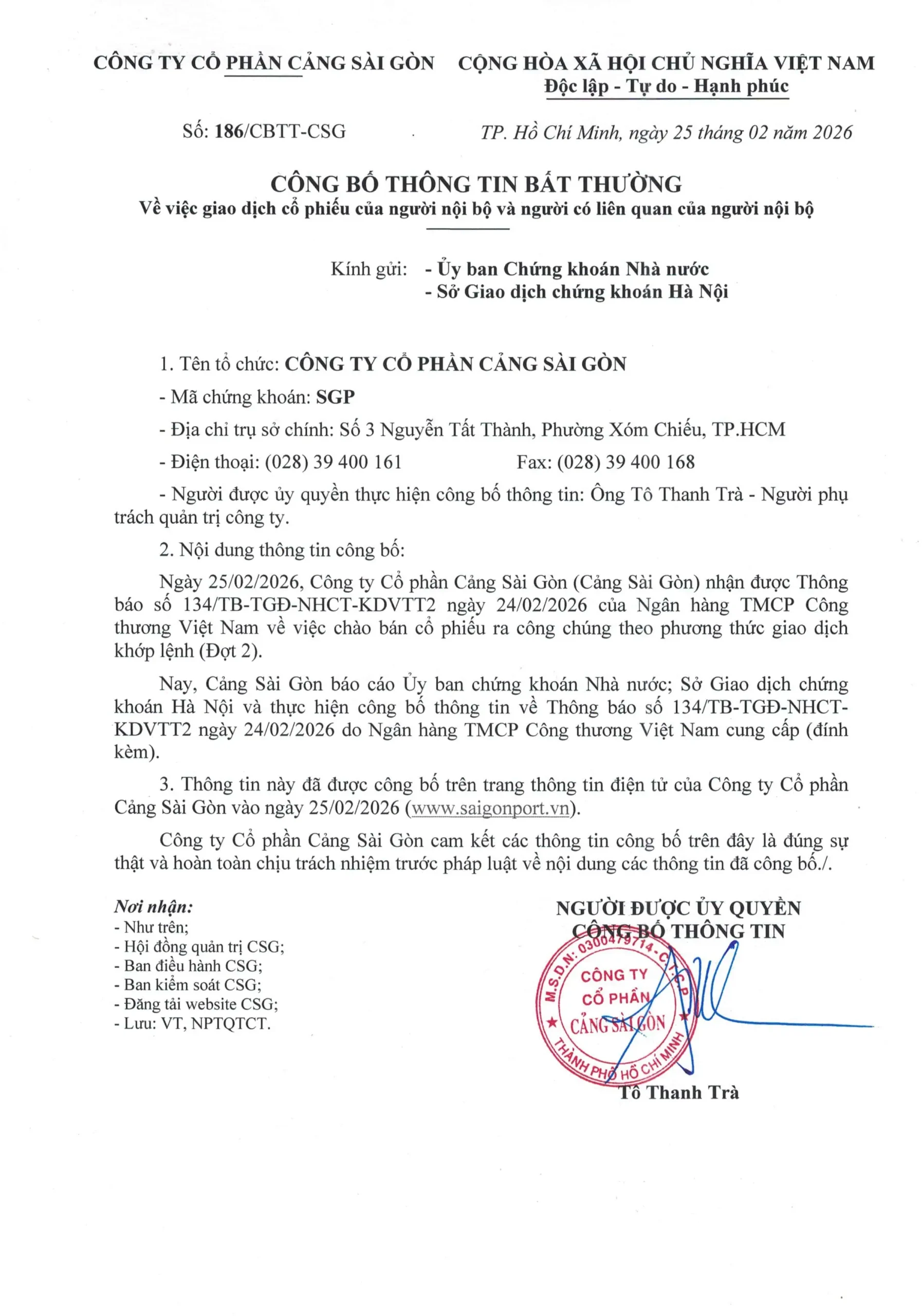 Công bố thông tin về người có liên quan Công ty Cổ phần Cảng Sài Gòn kiêm Chủ tịch Hội đồng quản trị Công ty Cổ phân Logistics Cảng Sài Gòn (Công ty có vốn góp chi phối của Cảng Sài Gòn) 30/01/2026