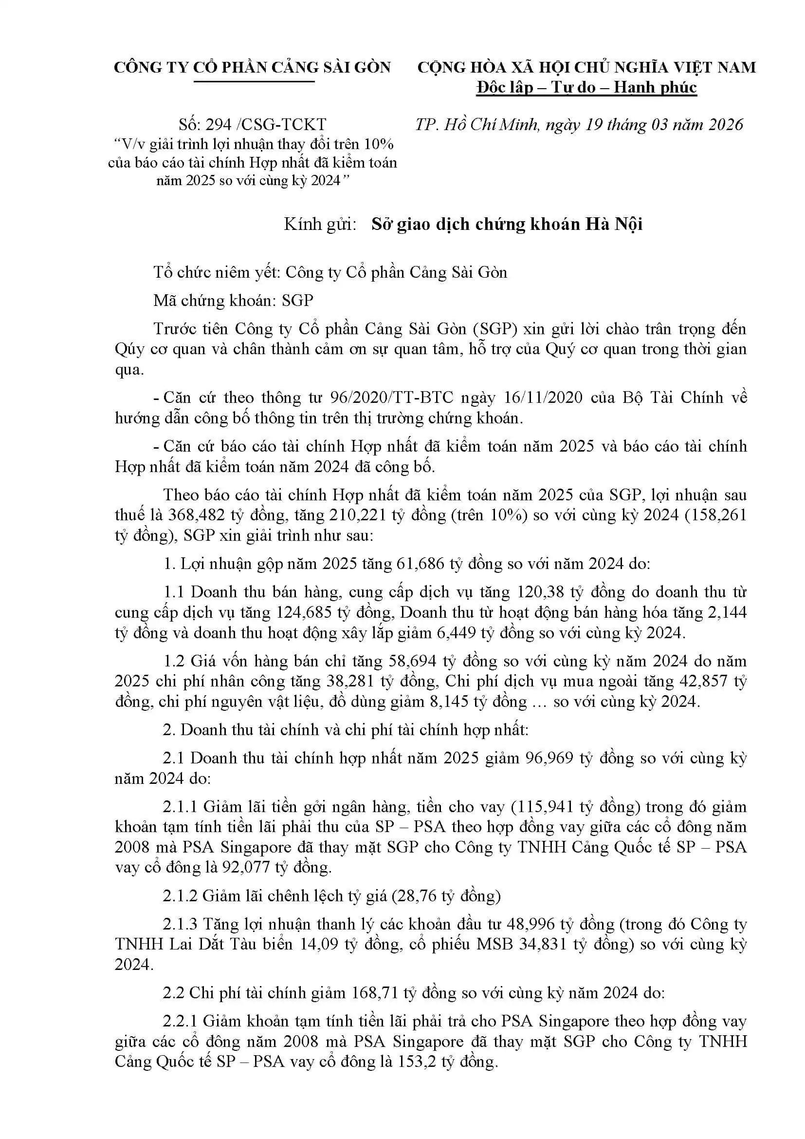 Giải trình lợi nhuận thay đổi trên 10% của báo cáo tài chính Hợp nhất đã kiểm toán 2025 so với cùng kỳ 2024 20/03/2026