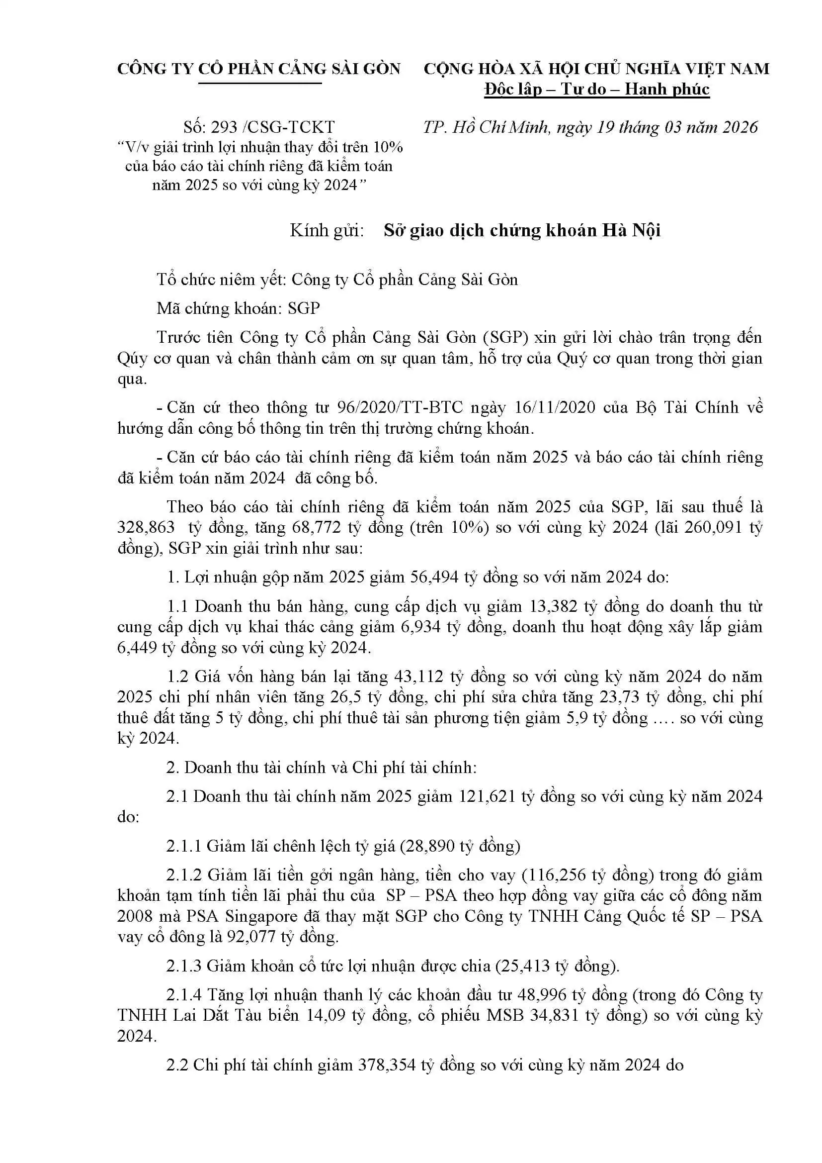 Giải trình lợi nhuận thay đổi trên 10% của báo cáo tài chính riêng đã kiểm toán năm 2025 so với cùng kỳ 2024 20/03/2026
