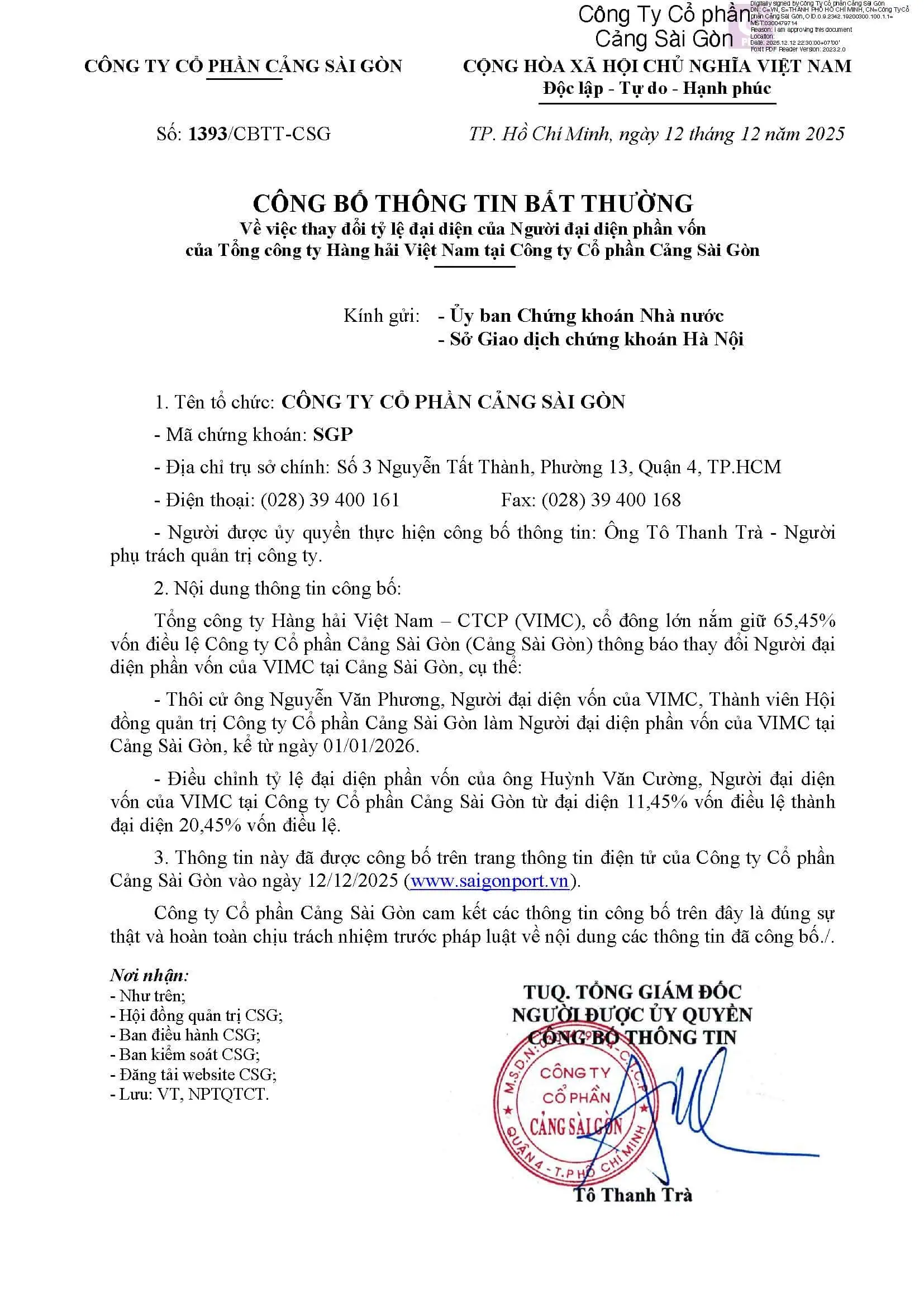 Công bố thông tin về việc thay đổi tỷ lệ đại diện của Người đại diện phân vốn của Tổng công ty Hàng hải Việt Nam tại Công ty Cổ phân Cảng Sài Gòn 12/12/2025