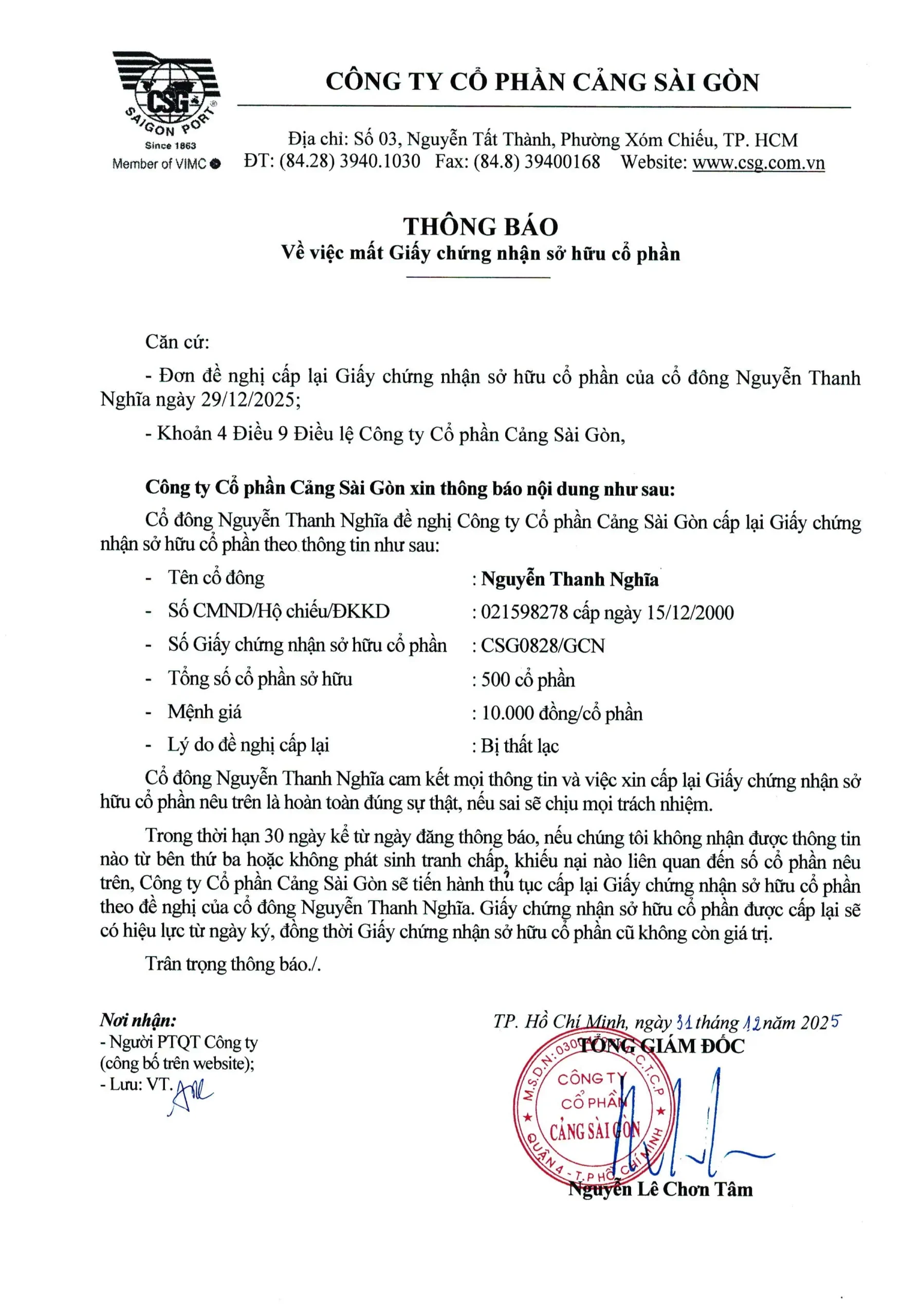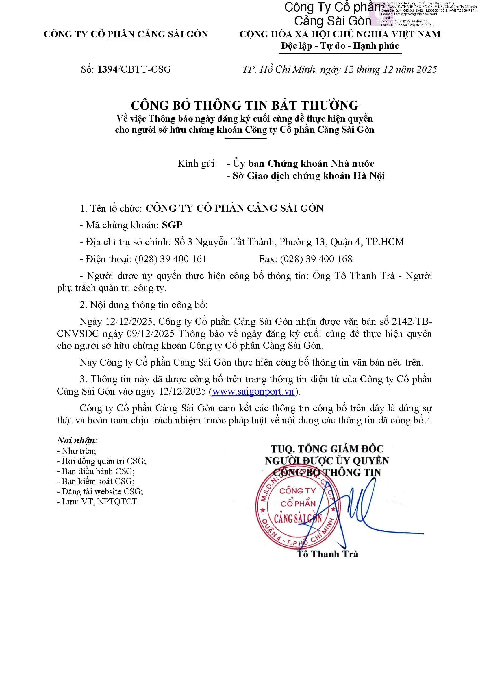 Công bố thông tin về việc Thông báo ngày đăng ký cuối cùng để thực hiện quyền cho người sở hữu chứng khoán Công ty Cổ phân Cảng Sài Gòn 12/12/2025