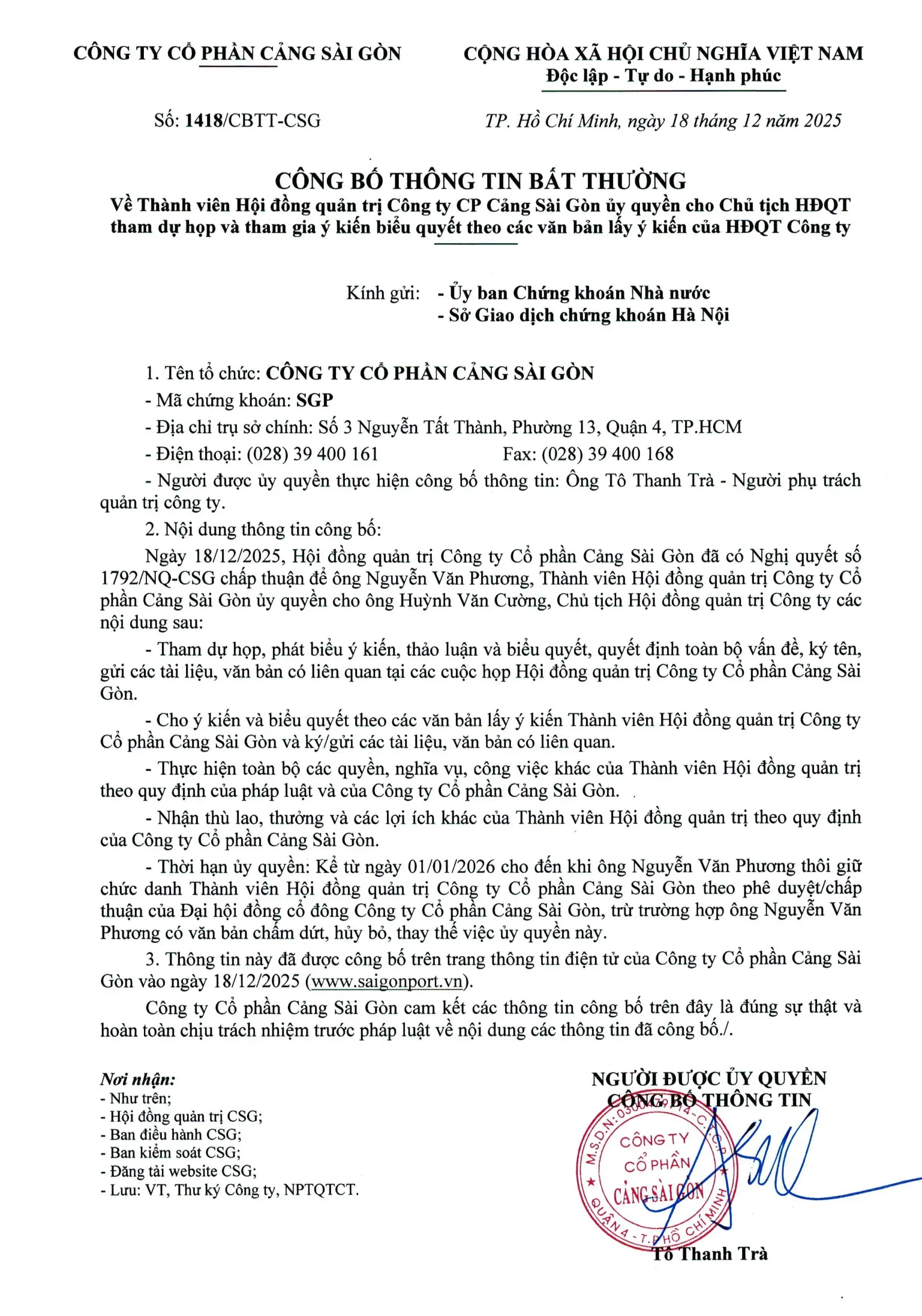Công bố thông tin về thành viên Hội đồng quản trị Công ty Cổ phân Cảng Sài Gòn uỷ quyền cho Chủ tịch HĐQT tham dự họp và tham gia ý kiến biểu quyết theo các văn bản lấy ý kiến của HĐQT Công ty 18/12/2025