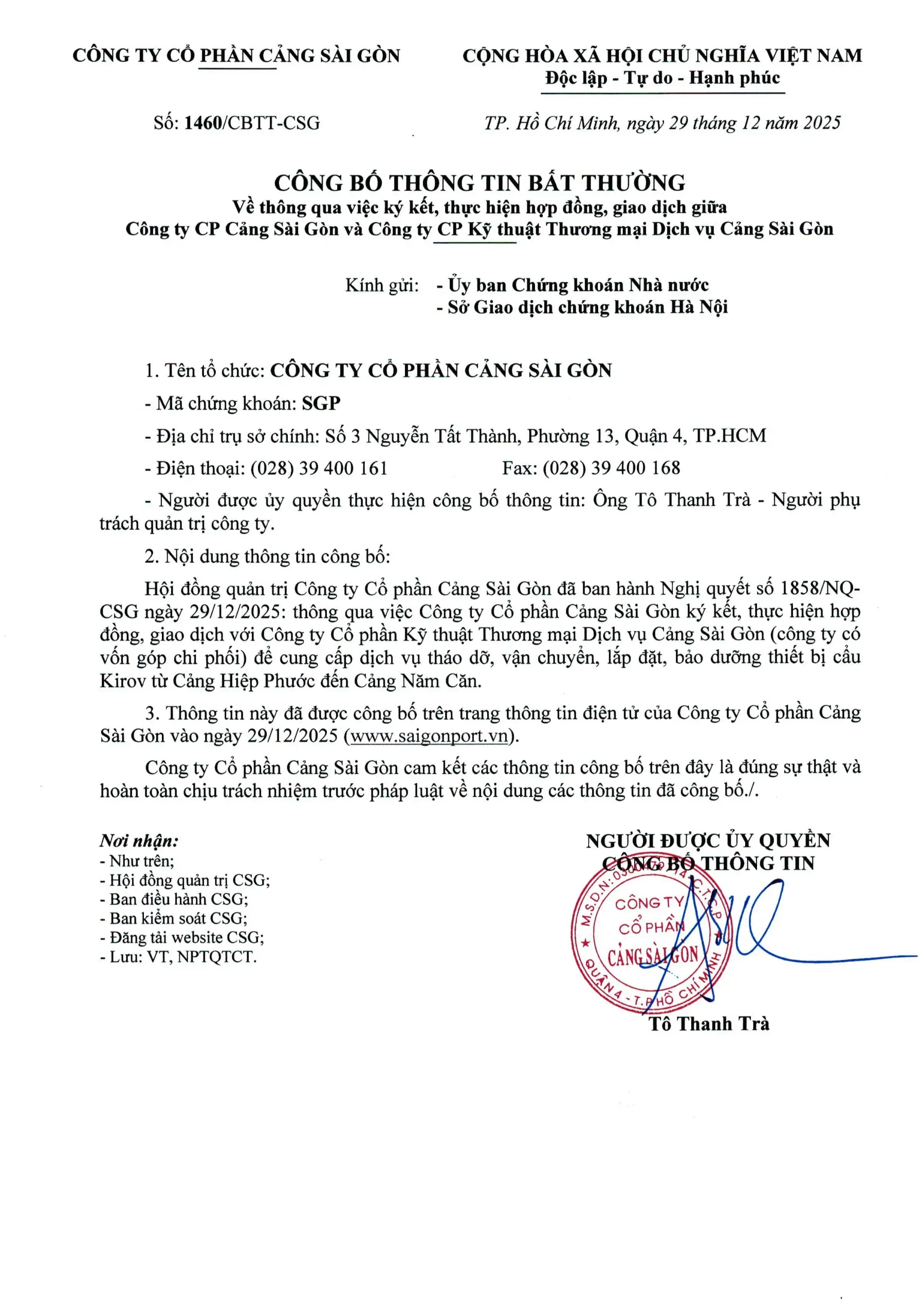 Công bố thông tin về thông qua việc ký kết, thực hiện hợp đồng, giao dịch giữa Công ty Cổ phần Cảng Sài Gòn và Công ty Cổ phần Kỹ thuật Thương mại Dịch vụ Cảng Sài Gòn 29/12/2025